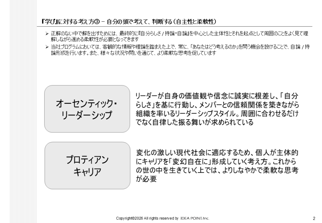 当社のプログラムでは、客観的な理論や情報を踏まえたうえで、「あなたはどう考えますか」、「あなたは何をしたいですか」と問い続ける機会を設けています。こうしたプロセスを通じて、自分なりの持論や判断軸が育っていきます。主体性を持ちながらも柔軟に変化できる思考は、リーダーシップやキャリア形成においても大きな強みになります。自分らしさを軸にしながら状況に適応できる人材こそ、変化の時代において価値を発揮できると考えています。