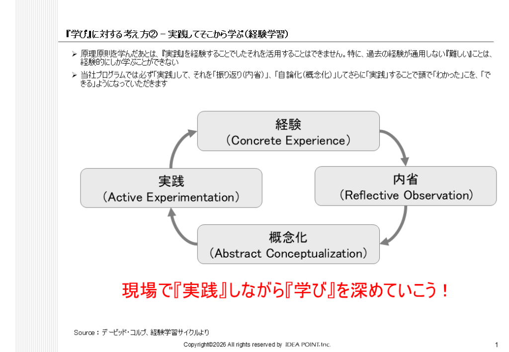弊社では、特に、「振り返り→概念化」のプロセスを重視しています。同じ経験から多くのことを学び、次に活かすためには概念化(自論化)のプロセスをどれだけ丁寧に実施できるかが重要です。多くの現場では、「ひたすら繰り返して、体で覚える」に近いことも多いようですが、必要なのはこの振り返り(内省) → 概念化(自論化)のプロセスです。特に、過去の成功体験がそのまま通用しない時代には、深い「内省」から得られる自分なりの手応えが、スキルを身につけるためには重要です。
