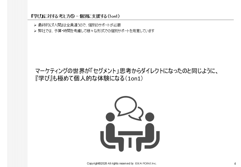 近年のマーケティングがマスから個別対応へと進化しているように、学びもまた個人的な体験へと変化しています。1on1の対話や個別フィードバックは、本人の課題認識を深め、行動変容を後押しします。例えば、上司やコーチとの定期的な対話によって、自分では気づかなかった強みや改善点が見えてくることがあります。当社では、時間や予算に応じてさまざまな形式の個別支援を提供し、一人ひとりの成長を支援しています。