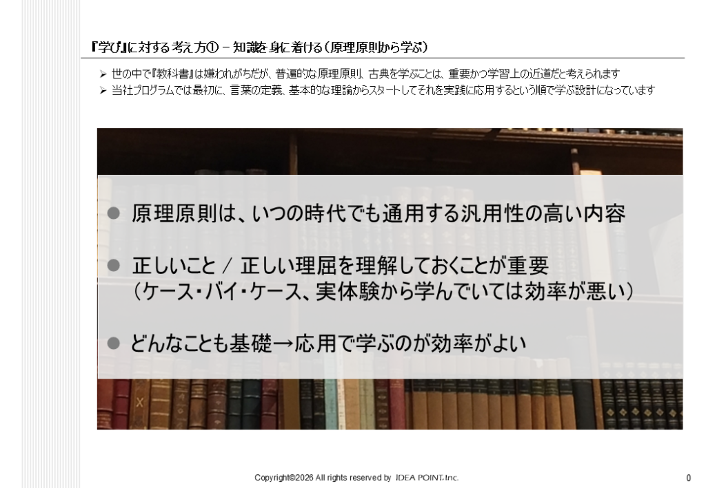 教科書はバカにしたものではありません。当社のプログラムでは必ず「定義と理論」からスタートしています。経験からしか学べないこともある一方で、やはり、定義と理論から学べることが多いと考えているからです。まずは、原理原則、基礎的な内容からスタートしましょう。