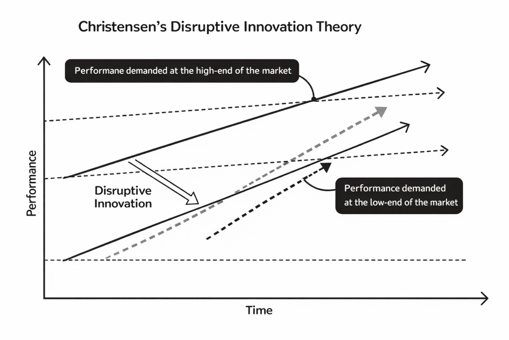 「破壊的イノベーション(Disruptive Innovation)」という考え方は、経営学者の クレイトン・クリステンセン が提唱しました。これは「新しい技術やビジネスモデルが、既存の大企業や主流の商品を追い抜き、市場のルールそのものを変えてしまう現象」を指します。